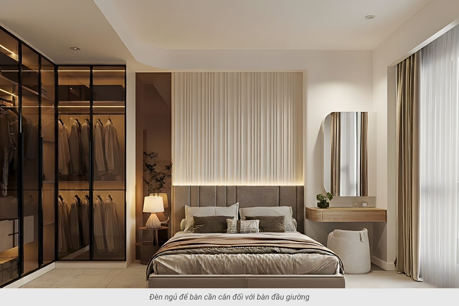 Phòng ngủ minimalism thường có diện tích gọn và ít đồ nên kích thước đèn cần cân đối với bàn đầu giường hoặc kệ đặt đèn. Đèn quá lớn sẽ làm không gian nặng nề, trong khi đèn quá nhỏ lại không đáp ứng đủ nhu cầu chiếu sáng buổi tối.