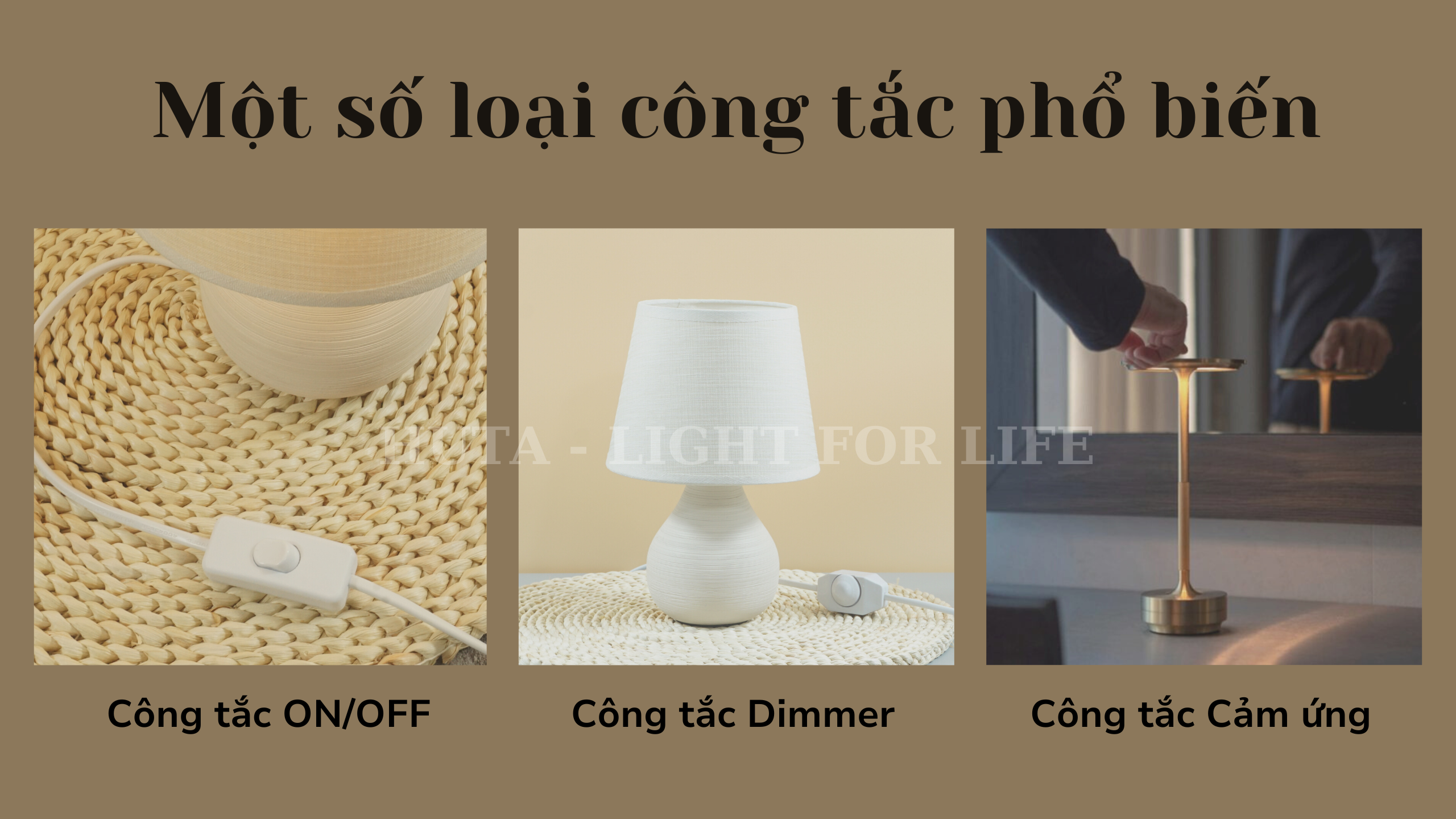 Hiện nay có rất nhiều loại công tắc được sử dụng, có thể kể đến như: Công tắc ON/OFF, công tắc Dimmer (tăng giảm độ sáng), công tắc cảm ứng, ...