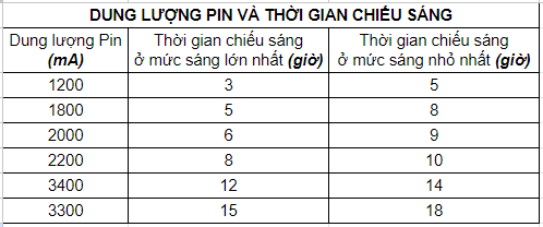 Bảng dung lượng Pin và thời gian gian chiếu sáng