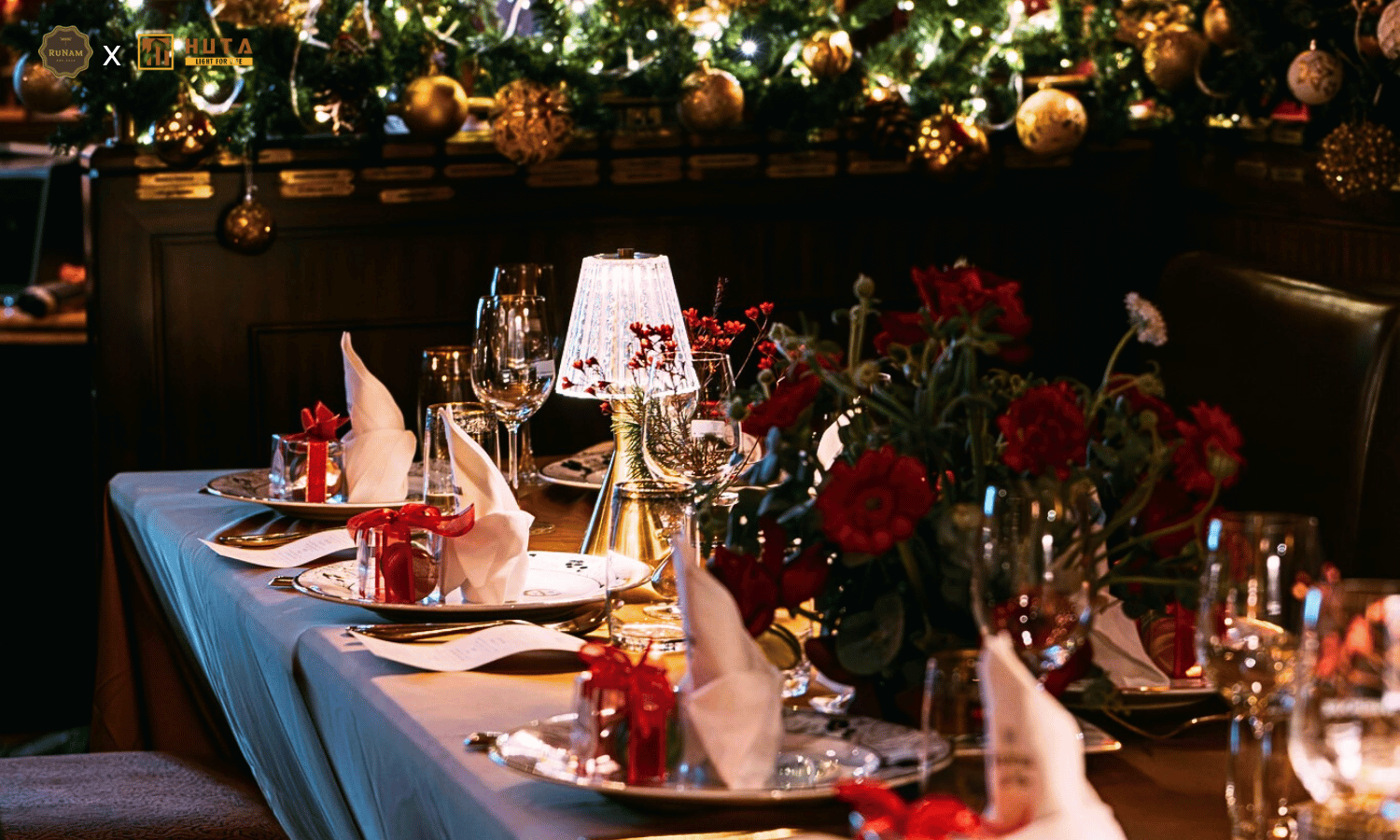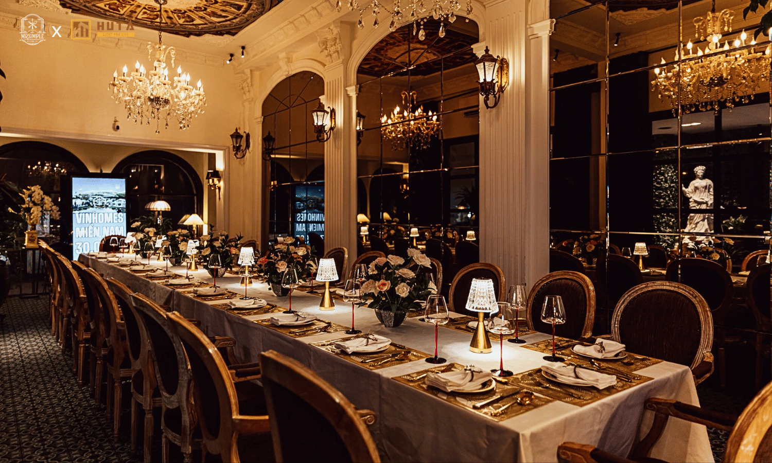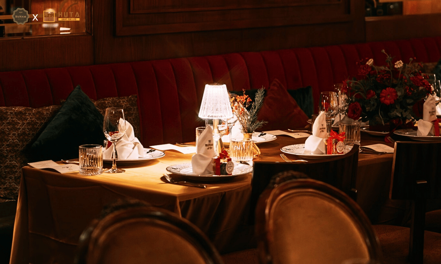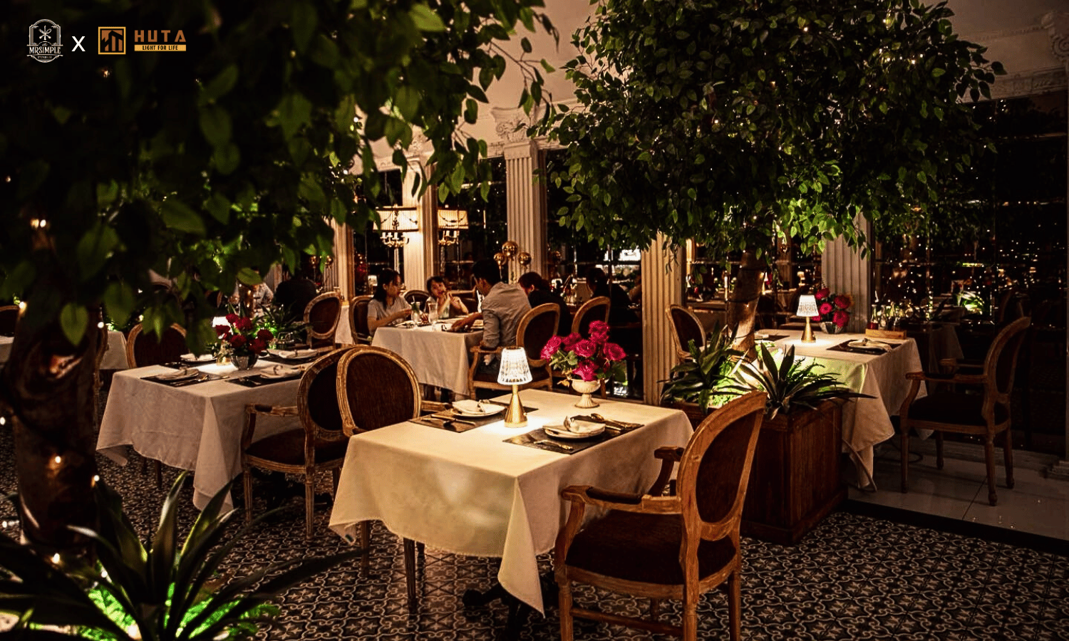 Nhà hàng RuNam d’Or là điển hình cho phong cách châu Âu cổ điển: tường gỗ, tranh sơn dầu, bàn ghế bọc da. Ở đây, ánh sáng vàng ấm 2400–2700K với độ sáng dim nhẹ đã biến không gian thành một “góc Paris giữa lòng Sài Gòn”.