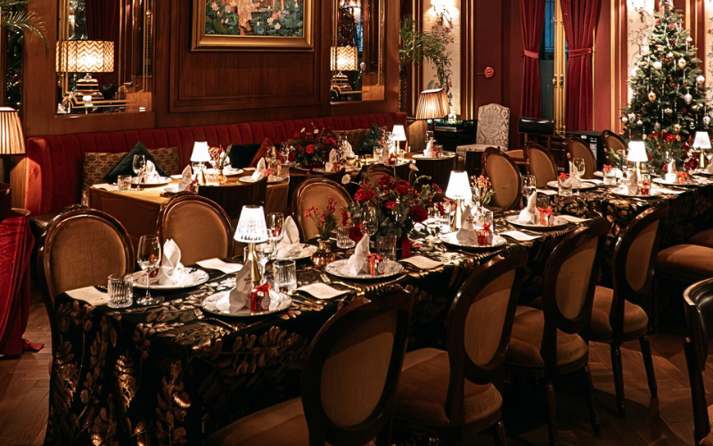 Không gian nhà hàng sang trọng với đèn bàn decor nổi bật, concept đồng nhất