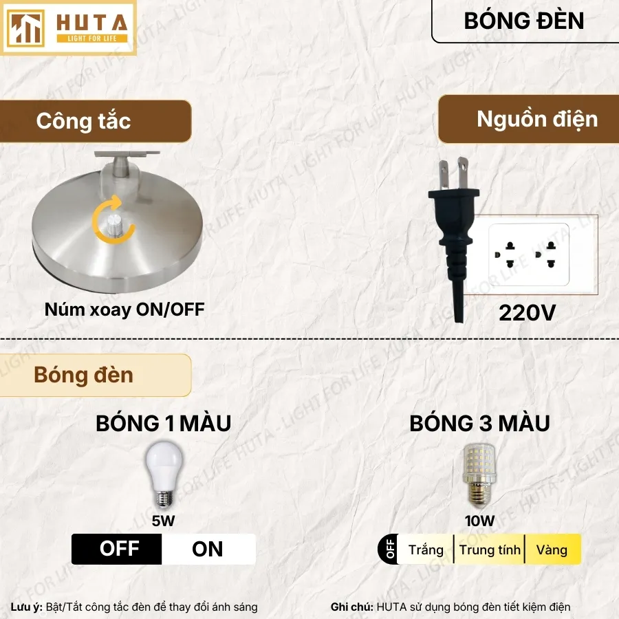 Bóng đèn: Sử dụng bóng đèn đui E27 điều chỉnh ánh sáng linh hoạt tùy vào nhu cầu của bạn.