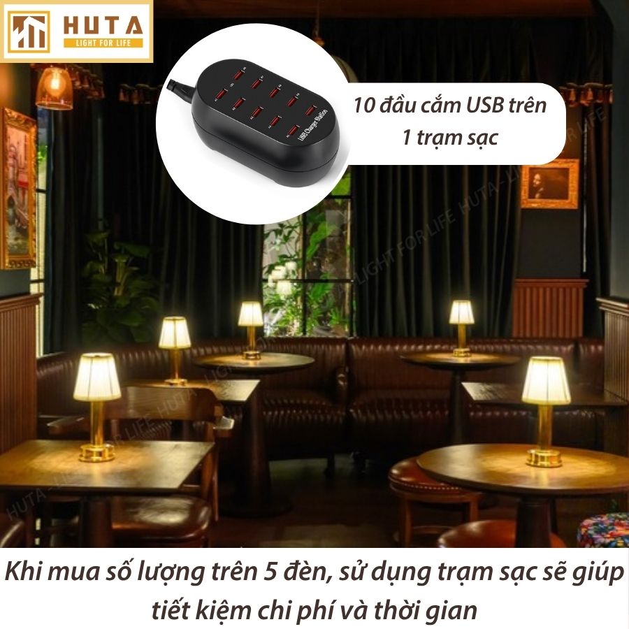 Để tiết kiệm chi phí và thời gian, khi mua trên 5 đèn bàn quán bar sạc tích điện bạn hãy mua kèm trạm sạc. Trạm sạc gồm 10 cổng giúp bạn dễ dàng sạc cùng lúc 10 đèn, sạc nhanh không bị nóng và phù hợp với dòng điện của đèn nên tránh làm hỏng pin, tăng tuổi thọ sử dụng đèn