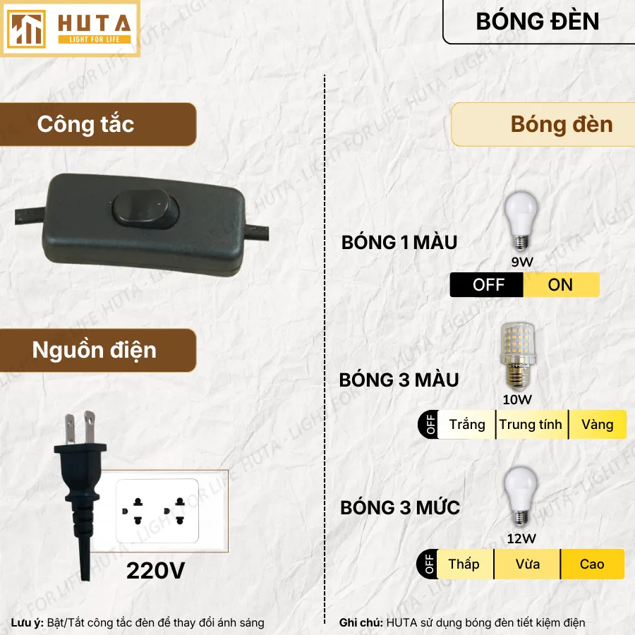 Bóng đèn: Sử dụng bóng đèn đui E27 thân thiện với môi trường và giúp kéo dài tuổi thọ của bóng và đèn.