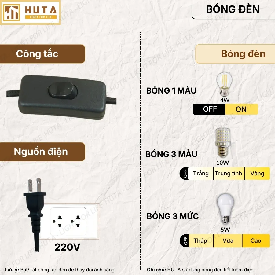 Bóng đèn: Sử dụng bóng đèn đui E27 thân thiện với môi trường và giúp kéo dài tuổi thọ của bóng và đèn.