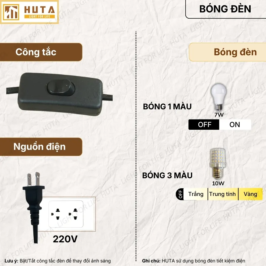 Bóng đèn: Sử dụng bóng đèn đui E27 thân thiện với môi trường và giúp kéo dài tuổi thọ của bóng và đèn.