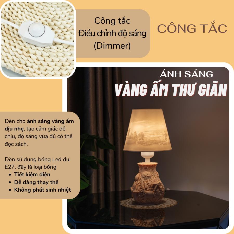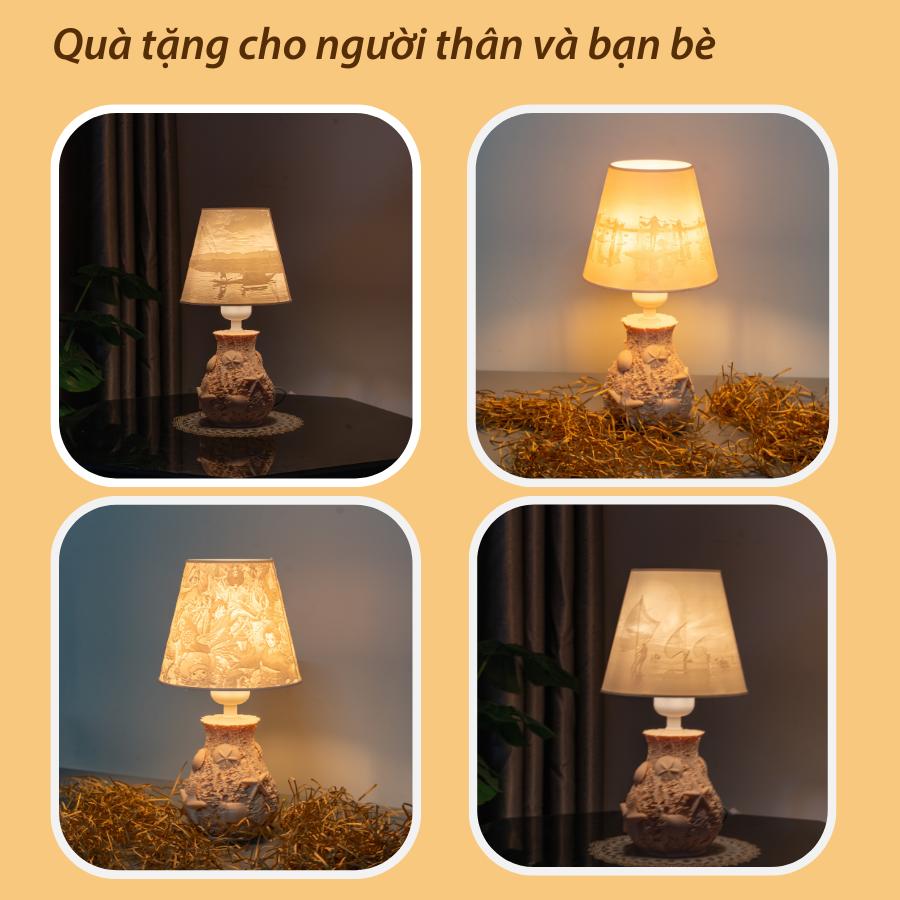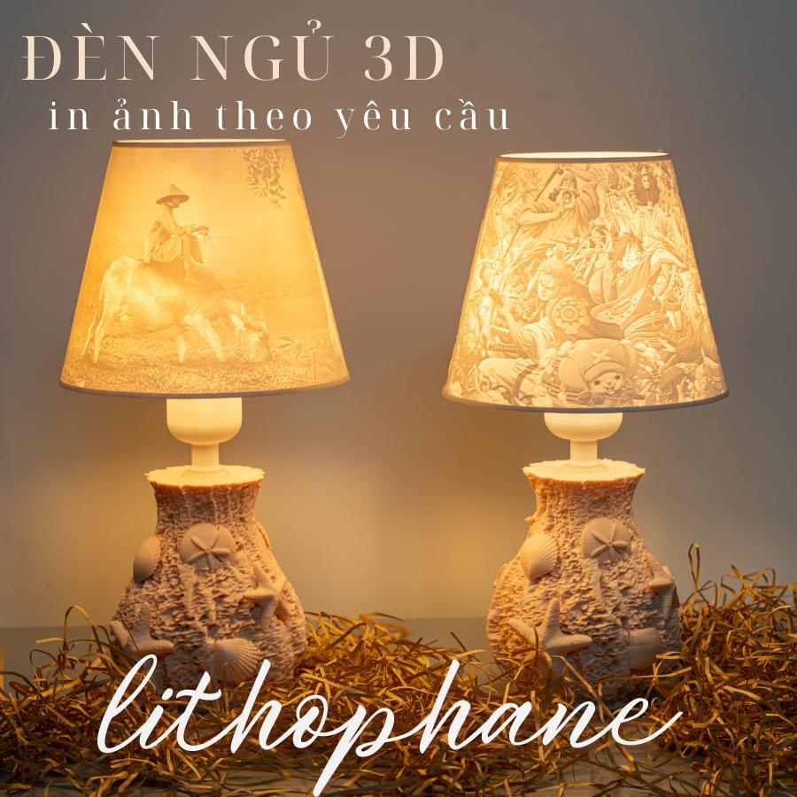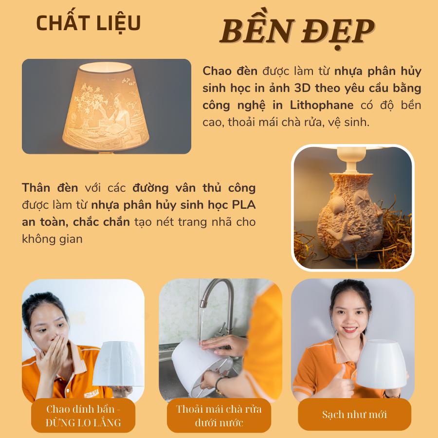 - Đèn để bàn trang trí được in LithoPhane bằng nhựa PLA tạo nên nét riêng, dùng để trang trí phòng ngủ, đọc sách đầu giường hay để bàn phòng khách, bàn ăn, kệ tường. Có thể điều chỉnh độ sáng phù hợp với không gian, vừa tăng tính thẩm mỹ vừa tiết kiệm điện.