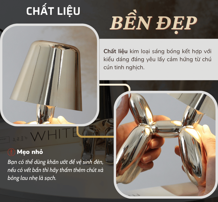 Đèn bàn trang trí DOGO được chế tác từ kim loại mạ bóng, bề mặt phản chiếu ánh sáng nhẹ nhàng, vừa dễ vệ sinh vừa giữ được vẻ sáng mới lâu dài. Kết cấu vững chắc giúp đèn bàn DOGO đứng ổn định trên mọi mặt phẳng.