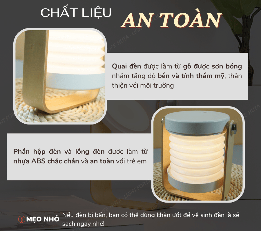 Chất liệu: Quai đèn bằng gỗ sơn bóng tăng độ bền và thẩm mỹ; phần thân từ nhựa ABS cao cấp chống trầy, an toàn cho trẻ em.