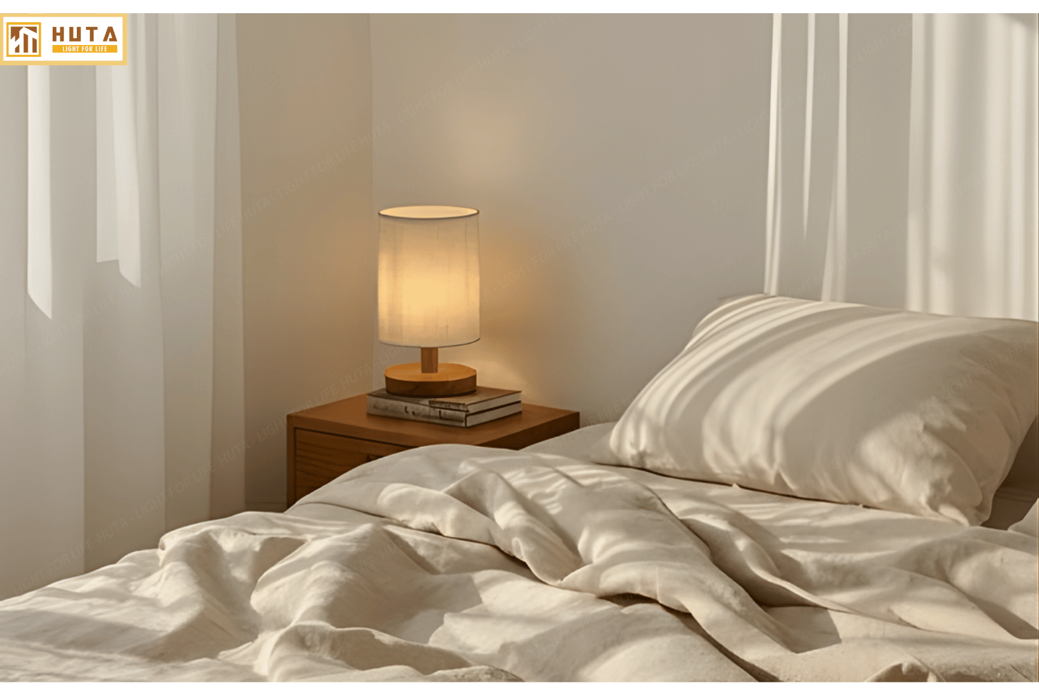 Phòng nhỏ (dưới 15m²): chọn đèn ngủ để bàn thân thấp, chao nhỏ, ánh sáng vừa đủ để tạo cảm giác thoáng và gọn.