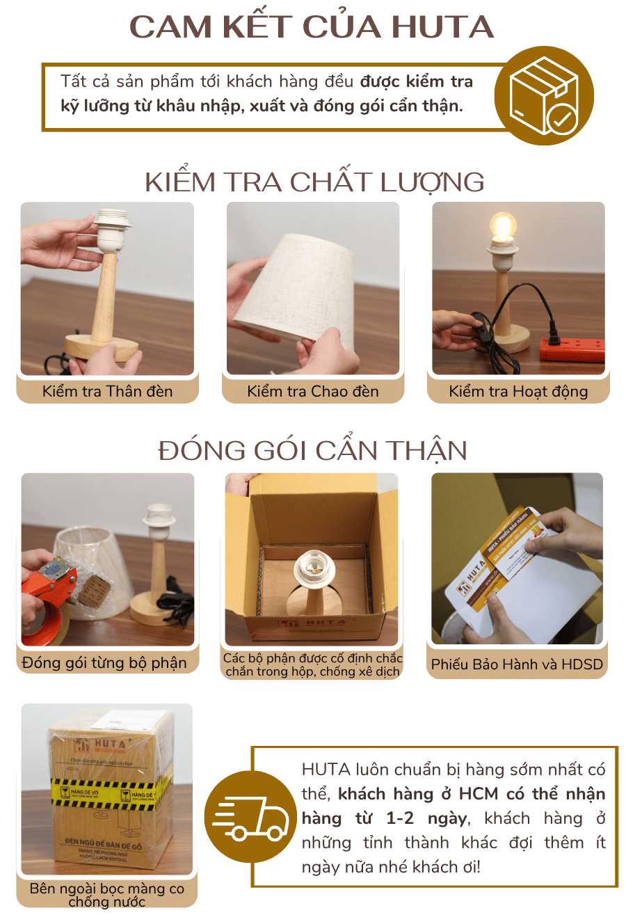 A: Khi giao đến tay khách hàng, đèn ngủ để bàn HUTA luôn được đóng gói và bọc cẩn thận với nhiều lớp chống sốc để đảm bảo an toàn. Khi giao đến nơi, quý khách có thể kiểm tra và nếu có hư hỏng do vận chuyển, HUTA sẽ đổi 1:1 miễn phí.