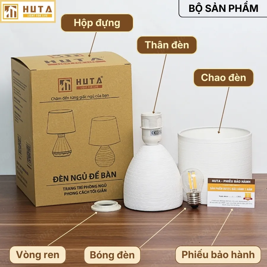 A: Khi giao đến tay khách hàng, đèn ngủ để bàn HUTA luôn được đóng gói và bọc cẩn thận với nhiều lớp chống sốc để đảm bảo an toàn. Khi giao đến nơi, quý khách có thể kiểm tra và nếu có hư hỏng do vận chuyển, HUTA sẽ đổi 1:1 miễn phí.