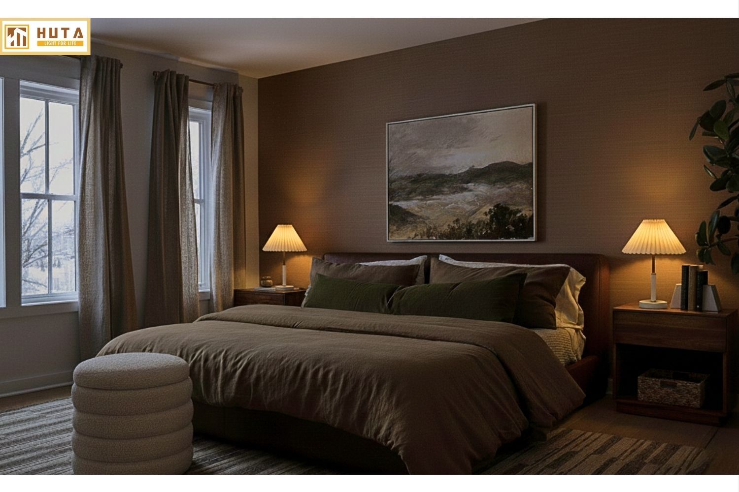 Thư giãn, nghỉ ngơi: dùng ánh sáng vàng dịu (2700K), ánh sáng khuếch tán đều qua chao vải sáng.