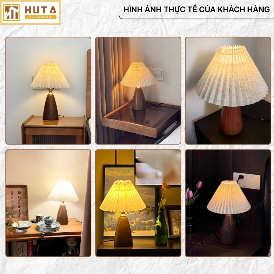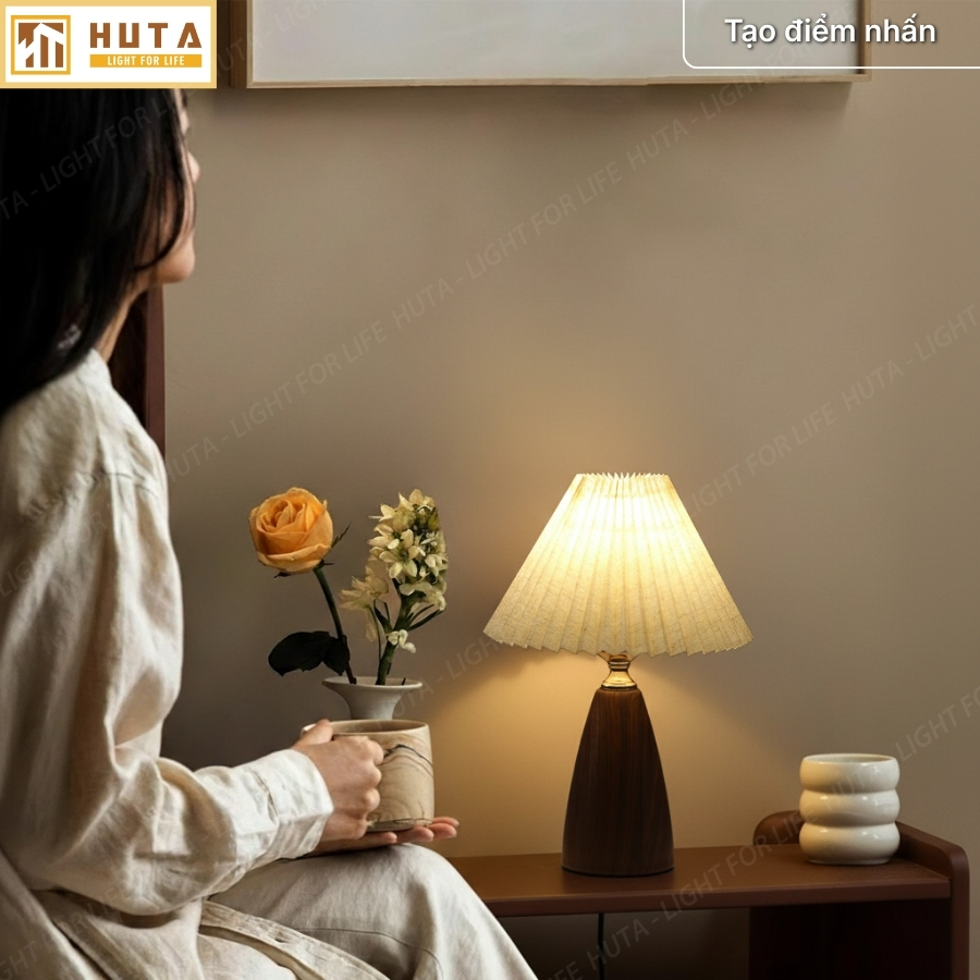 Đèn Ngủ Để Bàn HUTA Mã T10 Thân Kim Loại Vân Gỗ Vintage, Điều Chỉnh Ánh Sáng Vàng Ấm