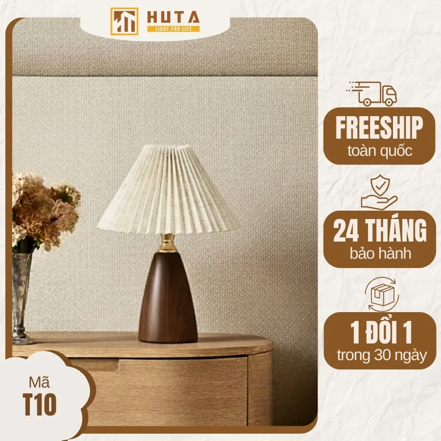 Đèn ngủ để bàn T10 với thiết kế cổ điển và ánh sáng vàng nhẹ dịu, chất liệu kim loại bền đẹp và chao vải sang trọng. Mỗi chi tiết đều được hoàn thiện tỉ mỉ để đảm bảo độ bền, an toàn và tính thẩm mỹ cao.