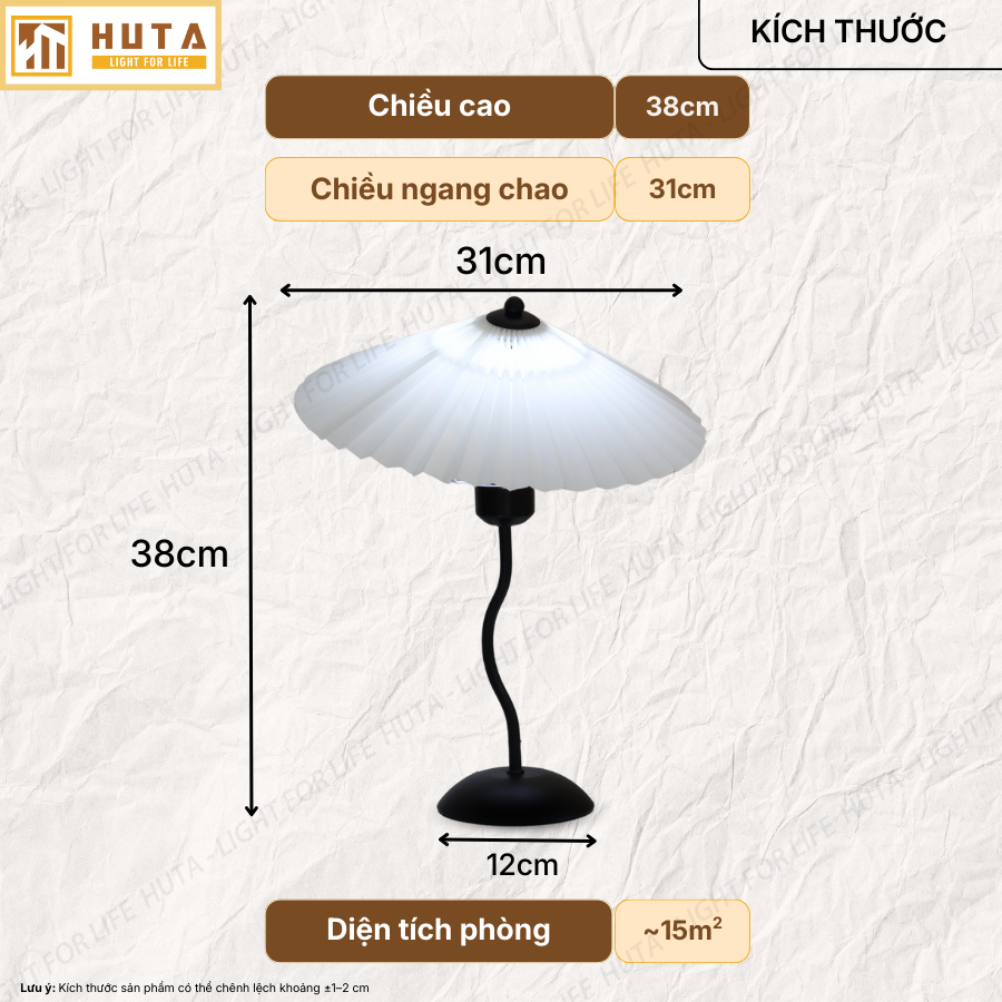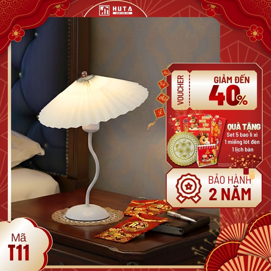 Đèn Ngủ Để Bàn HUTA Mã T11 Thân Kim Loại, Chao Xếp Ly Vintage, Đầu Cắm Điện 2 Chấu 220V