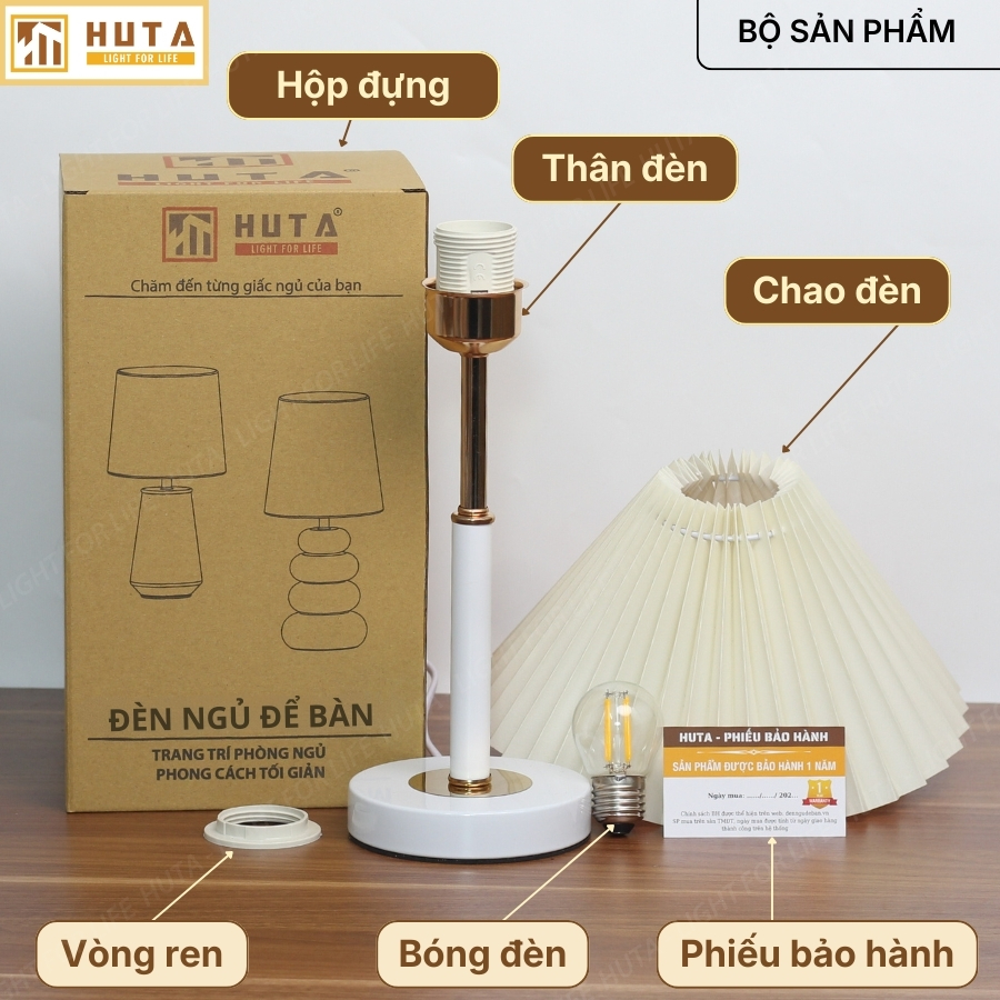 A: Khi giao đến tay khách hàng, đèn ngủ để bàn HUTA luôn được đóng gói và bọc cẩn thận với nhiều lớp chống sốc để đảm bảo an toàn. Khi giao đến nơi, quý khách có thể kiểm tra và nếu có hư hỏng do vận chuyển, HUTA sẽ đổi 1:1 miễn phí.