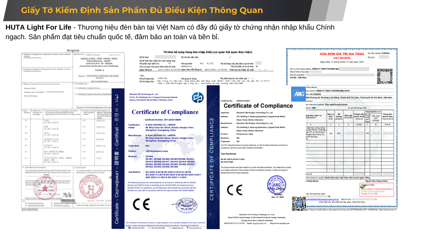 Tất cả giấy tờ đều đáp ứng tiêu chuẩn kiểm định nghiêm ngặt, đảm bảo sản phẩm đèn bàn LED HUTA luôn đạt chuẩn an toàn và nguồn gốc rõ ràng.