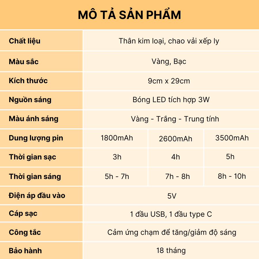 A: Đèn được bảo hành 18 tháng và bảo hành pin 6 tháng