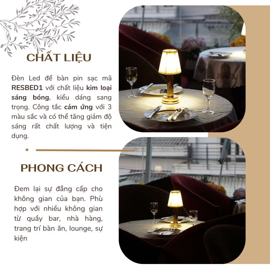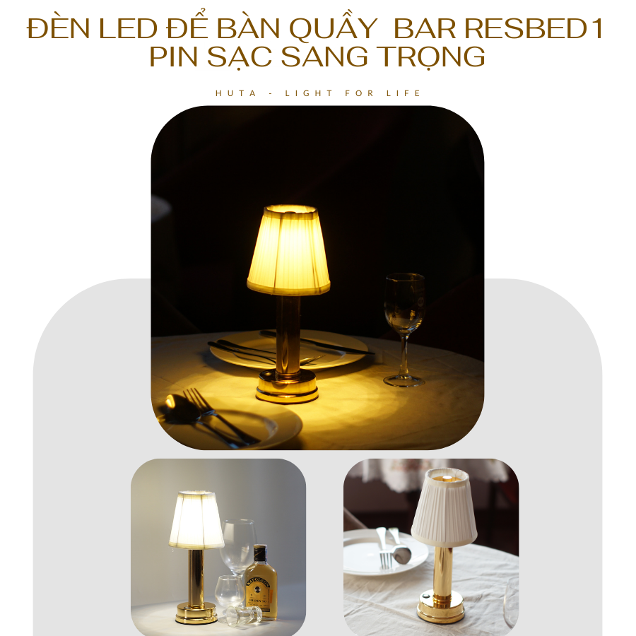Đèn Bàn Led Quầy Bar, Quán Bar, Bàn Ăn Nhà Hàng, Quán Cà Phê, Cảm Ứng, Pin Sạc, Tích Điện, Ánh Sáng Vàng Điều Chỉnh Độ Sáng Mã RESBED