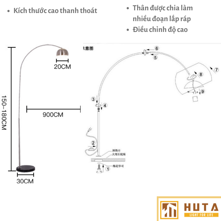 Đèn có kích thước linh hoạt để bạn tùy ý điều chỉnh độ cao, Đèn đứng phòng khách - HUTA Mã KC3 có kiểu dáng hiện đại phù hợp với mọi không gian từ phòng ngủ cho tới phòng khách.