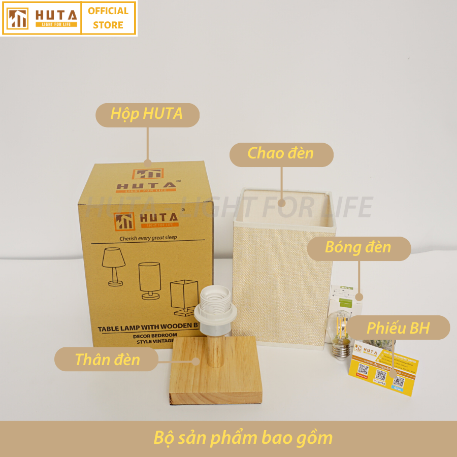 Sản phẩm gồm thân đèn, bóng đèn led, chao đèn, phiếu bảo hành và hộp thương hiệu của HUTA